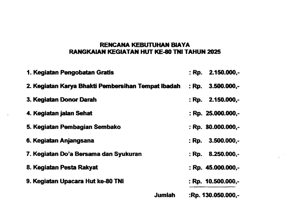 Kegiatan : Kegiatan sosial dan rangkaian peringatan HUT TNI Ke-80